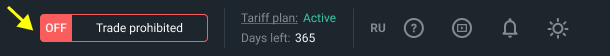 To create an order, you need to enable trading in the terminal. Move the indicator that prohibits trading to the Trade Allowed mode. The indicator colour will change from red to blue.