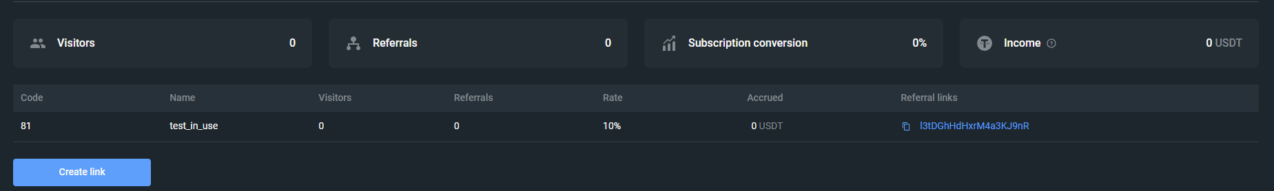 * Доход - отображение суммы реферальных начислений в USDT